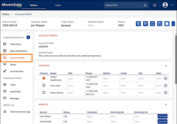 Account Profile (Figure 91) has the information that is available within the desktop version of MoversSuite > Account Profile. Features on this screen include the following sections and details: