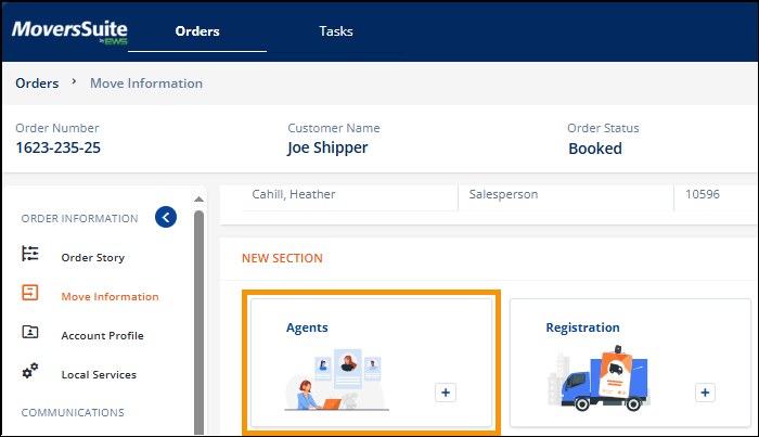 Figure 40: Move Information > New Section > Agents tile. The tile may not be in this exact location on your transaction.