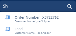 Match on Order Number, Customer Name, and/or Lead Represents search result based on Order Number, Customer Name, or Lead. The example shows a search using “Shi” the results indicating an Order Number was returned based on the Customer Name and a Lead returned based on a Customer Name.
