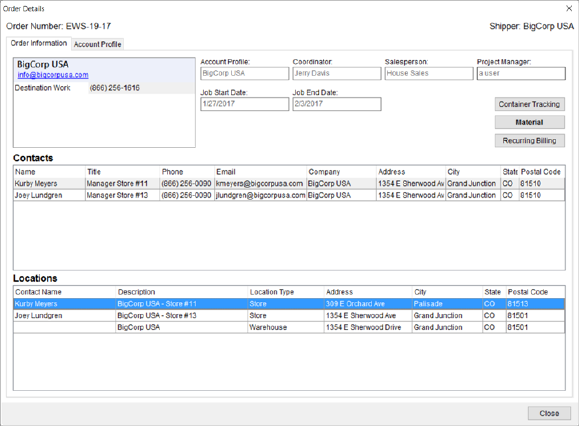 This section displays a list of locations set for the order through the Locations section within the Contacts and Locations tab. |