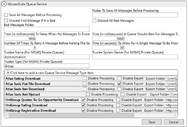 MoversSuite Administration > Queue Service > Queue Service Setup