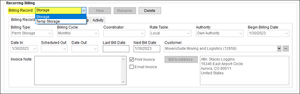 Enter information into the fields. Billing Type, Billing Cycle, Begin Billing Date and Date In are required to this recurring billing record to link this record to the Recurring Billing Generation process. Billing Type options are the records into in Storage Type Setup. See Billing Record for more information on the fields.