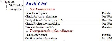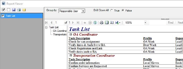 The provide various panes depending on the needs of the particular report. In the Task List Report example (above), a pane on the far left features the Task List report with a checkbox. This pane may or may not display. It is available in the case of multiple reports linked to a single function, such as those generated for Commission Statement Management and Customer Statements.