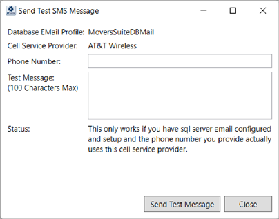 Test the service provider and related SQL Server email profile by providing the cell number and text message and by pressing Send Test Message. The Status informs you of what fields are missing and whether the message was sent. Confirm the results of the test by checking the device associated to the Phone Number for receipt of the specified message.