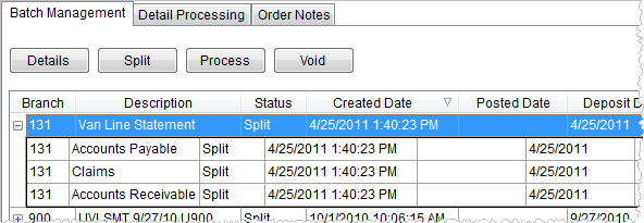 The batch and related split groups will have a status of “Split” and each split group will display a Control Amount that reflects the total dollar amount of all transactions within each grouping. Use the Details button in Batch Management to view the split group summary data and to update the Control Amount associated to the particular group through the Statement Detail screen.