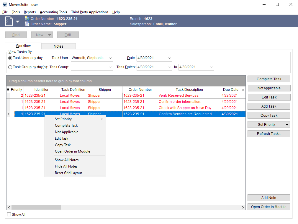 To manage tasks across multiple orders, you can use the Tasks Module. Themain Workflow tab within this module allows you to filter tasks by a user and day or by the Task Group and a date range. The Workflow tab is designed for managerial level oversight of processes.
