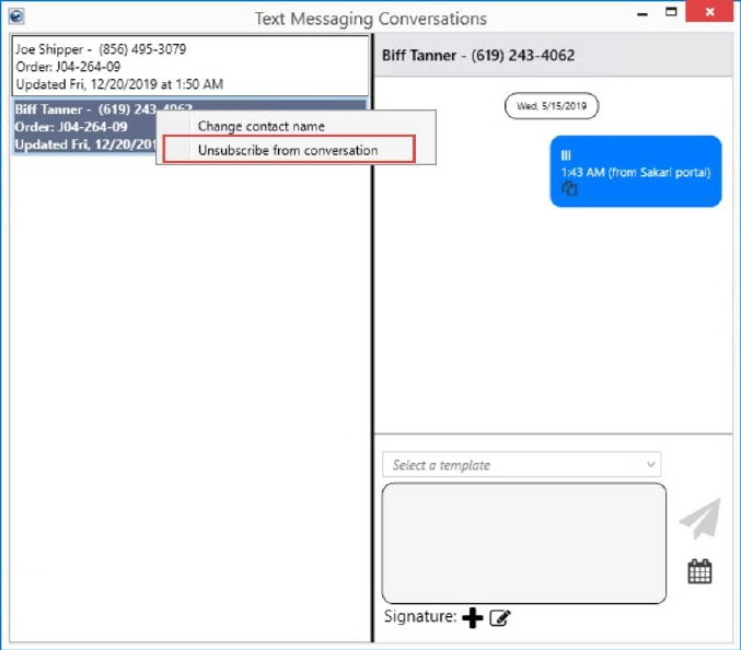 •An ongoing conversation can be removed from the Text Messaging Conversations window through the Unsubscribe From Conversation option.