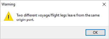 If you attempt to enter the same Origin Port more than one, the application warns you with a message of “Two different voyage/flight legs leave from the same origin port.” This is to assist you in avoiding circular routes.