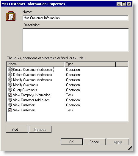 Press the Properties action (Actions > Properties) to access the Mss Customer Information Properties screen