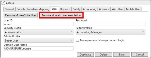 Administrators can view the Windows environment associated to the user through the Domain User Name field found on the User tab within Personnel Setup. In the example below (Figure 30), the record is authenticated through the MOVERSSUITE domain for the aruppe user. This is the domain user that the person logged into Windows using.