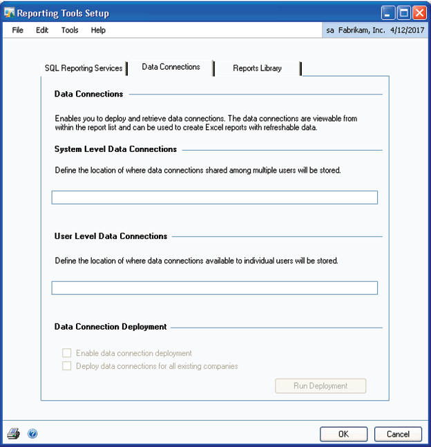 Click the Data Connections tab on the Reporting Tools window and enter a location where you want to store data connections in the System Level Data Connections field. Select the Data Connection Deployment options to enable data connections and deploy for all companies. If a company is added in