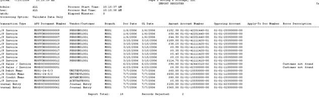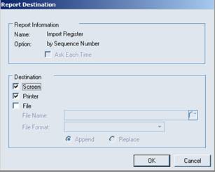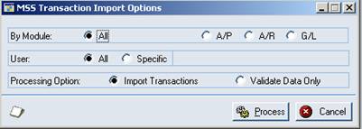 Report Destination window will open. Select where you want it to print. The MSS Import Register will print and transactions will be imported into Great Plains. Transactions with errors will not import until errors are resolved.