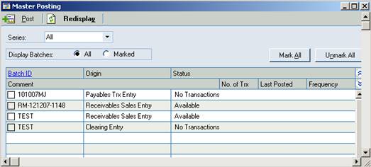 Mark appropriate batches, and Post. The Batches will start with RM-######-####, PM-######-####, GL-######-#### and CR-######-####.