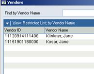 Enter the Vendor ID. Lookup can be used on this field. Click on the magnifying glass. Once in the window, place the mouse over the Vendor Name and click on it. This changes the search criteria to Name. Tab.