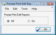 Use this window to turn On and Off the prompt to Print Edit Reports after Calculating Payroll Checks and printing the Precheck report. To open this window, click the HR and Payroll series button, then click Payroll on the Setup