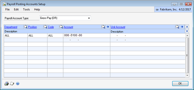 FIGURE 27: PAYROLL POSTING ACCOUNTS SETUP WINDOW